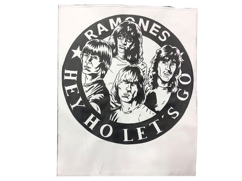 Parche de tela para coser en chaquetas también conocido como espaldera del grupo Ramones con su frase "Hey Ho Let`s Go"